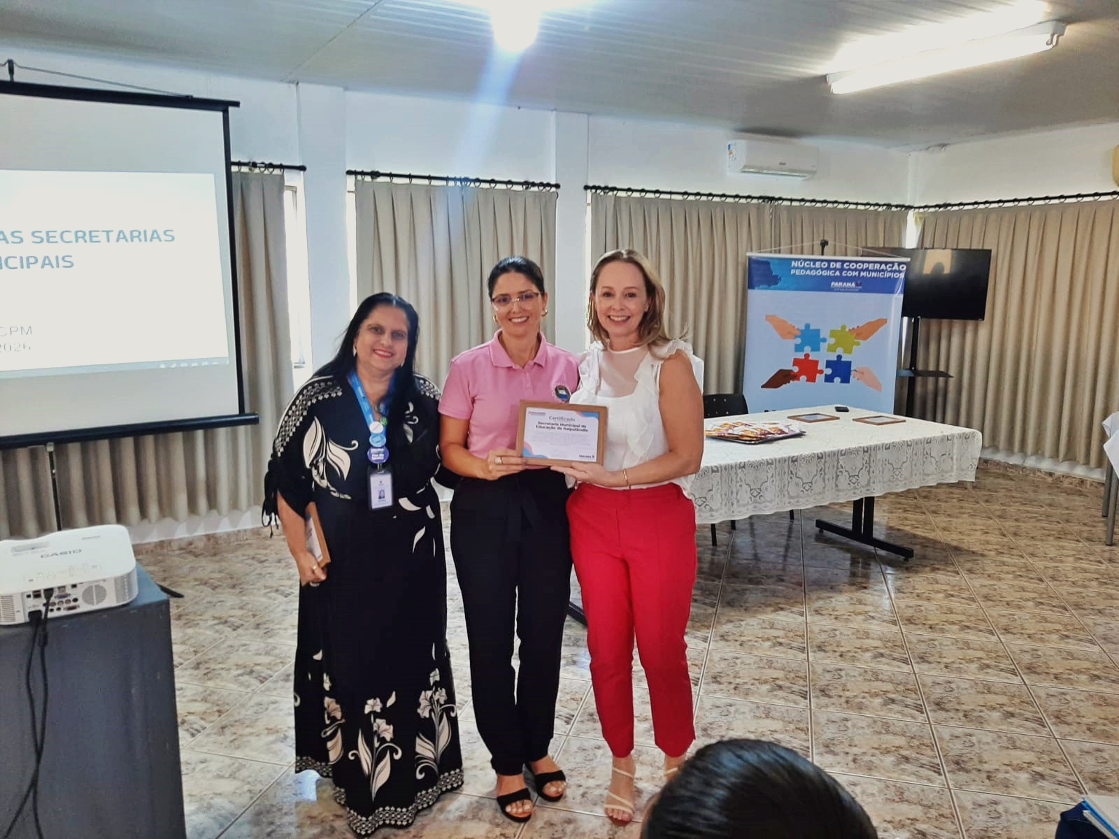 A homenagem foi entregue durante reunião de alinhamento realizada com gestores e representantes dos municípios, coordenadores e articuladores regionais do Núcleo Regional de Educação de Foz do Iguaçu, destacando o compromisso do município com o regime de colaboração entre Estado e municípios e com a qualificação permanente dos profissionais da educação.