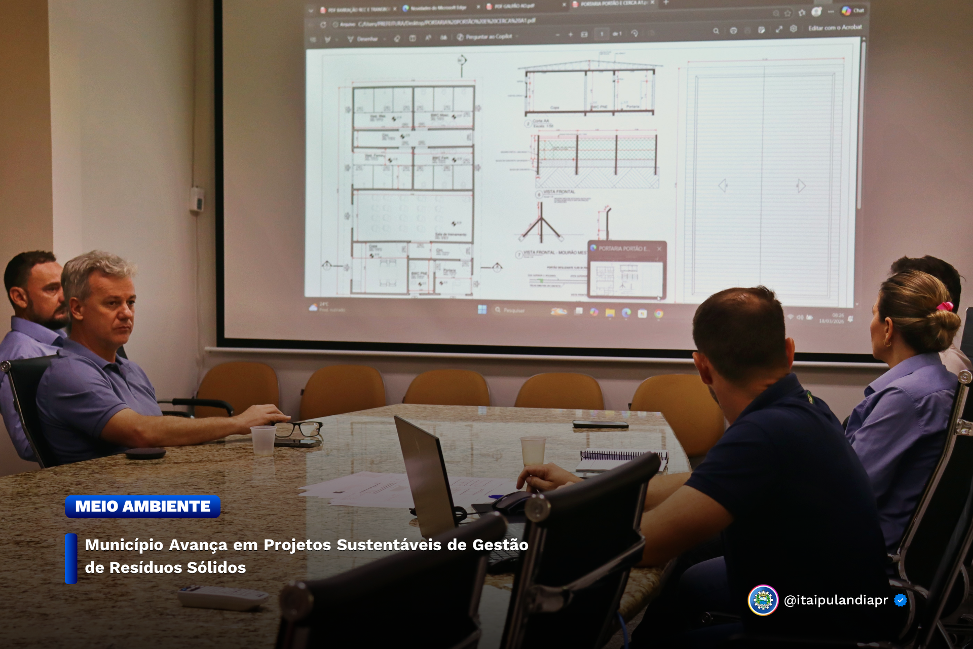 A Secretaria Municipal de Meio Ambiente, em parceria com a empresa LLA Engenharia, realizou em 18 de março de 2026 uma reunião presencial com gestores municipais e equipes técnicas responsáveis pela gestão de resíduos sólidos. O encontro, realizado na sala de reuniões do Paço Municipal, contou com a presença do empresário ambientalista Letieri Angeli, que apresentou projetos técnicos e as etapas para a regularização da área de destinação de resíduos inertes e volumosos.
