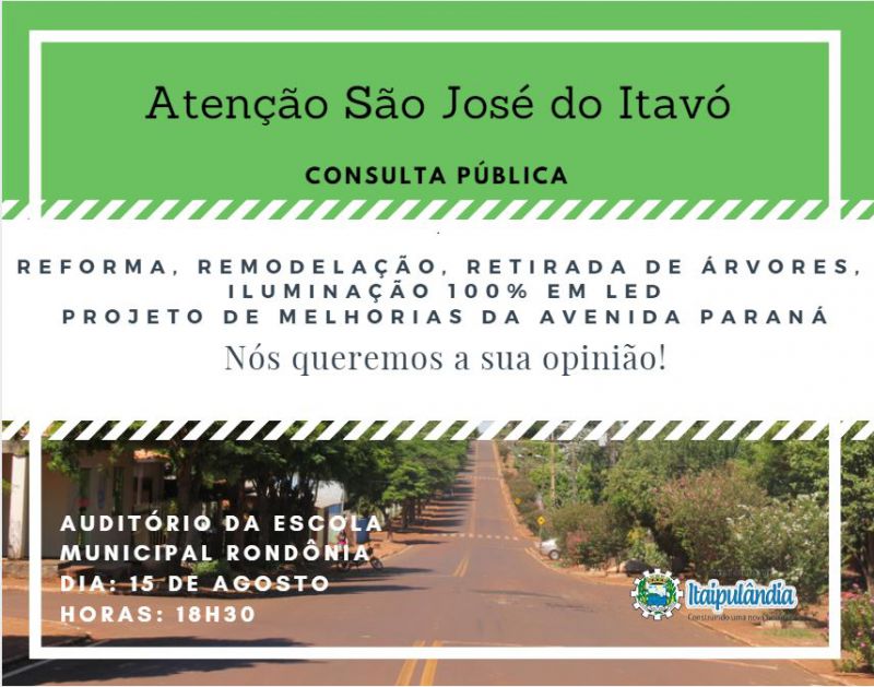 A Administração Municipal de Itaipulândia, juntamente com a secretaria de Agricultura e Meio Ambiente e de Planejamento, convoca a população em geral para uma importante Consulta Pública que acontecerá no auditório da Escola Municipal Rondônia em São José do itavó.