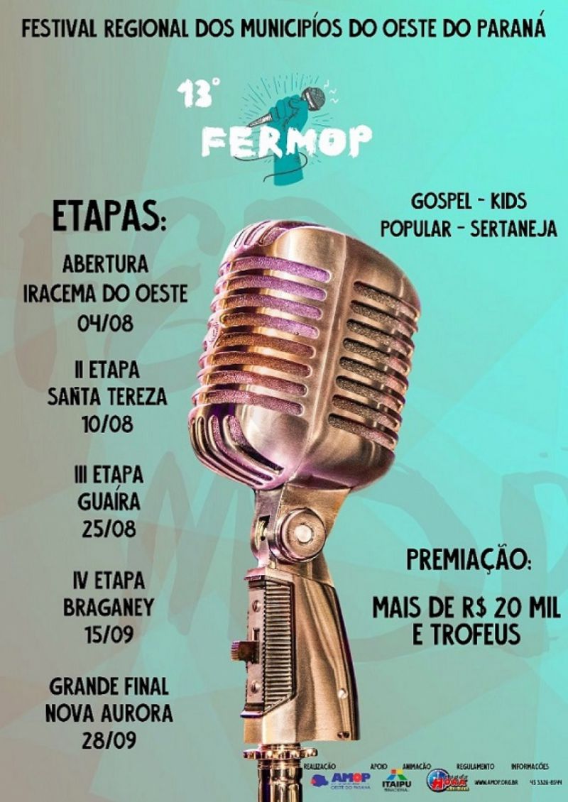 Os talentos itaipulandienses mais uma vez irão subir ao palco para representar Itaipulândia. Desta vez, as vozes apresentam-se no município de Guaíra neste sábado, 25 de Agosto, onde acontece a III etapa do FERMOP, Festival Regional da Canção da AMOP( Associação dos Municípios do Oeste do Paraná).