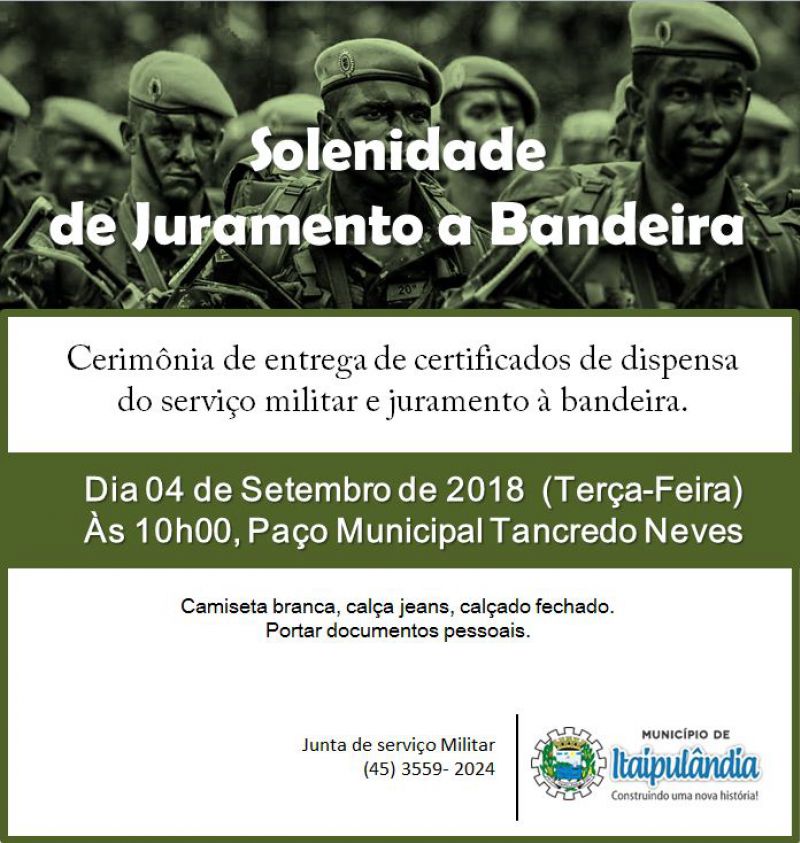 -A junta de serviço militar do municÃpio de Itaipulândia, convoca a todos os jovens que completaram 18 (dezoito) anos em 2018, para participarem da cerimônia de entrega de certificados de dispensa do serviço militar e juramento à bandeira.