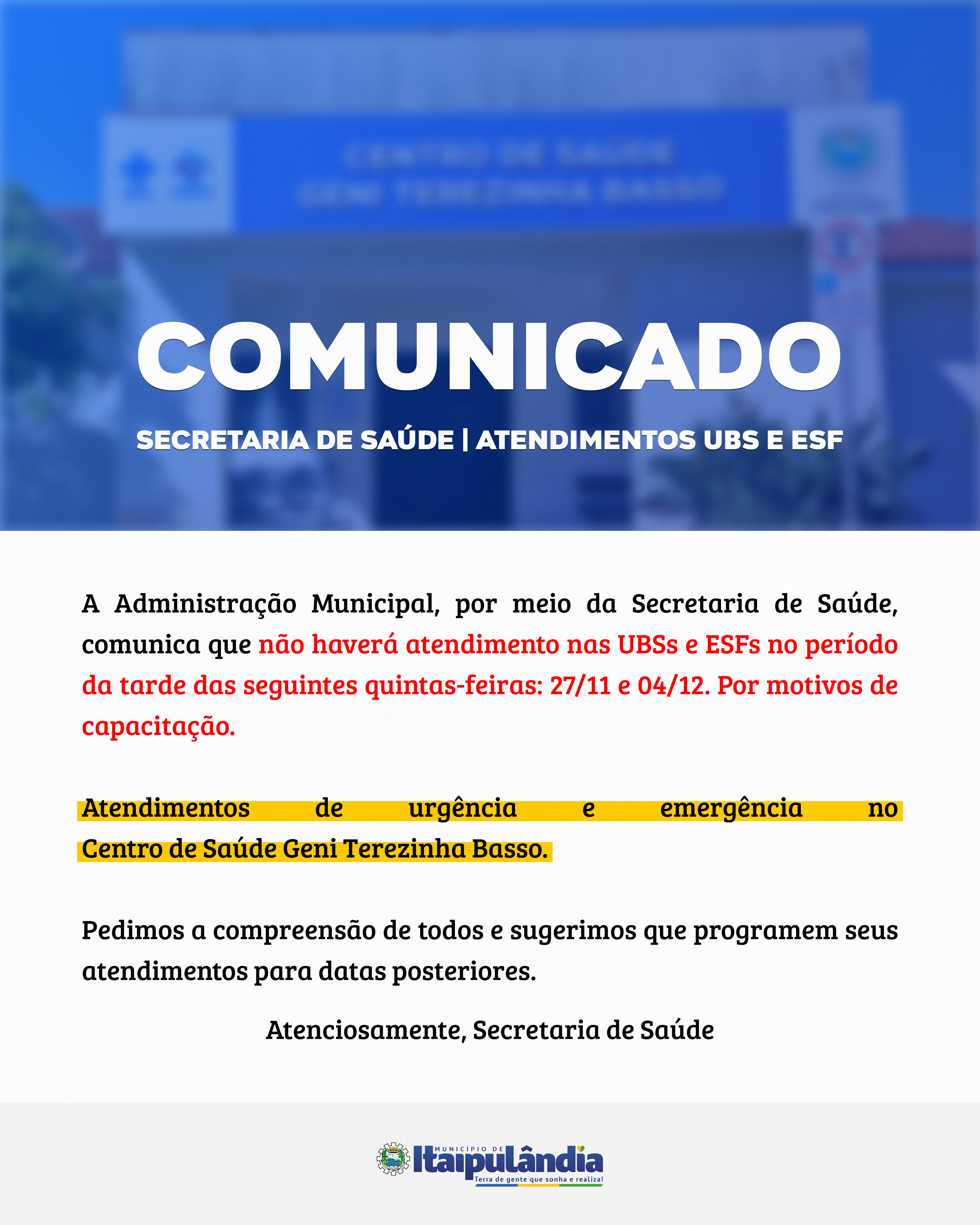 Confira o comunicado da Secretaria de Saúde sobre o horário do atendimento das UBS e ESF.