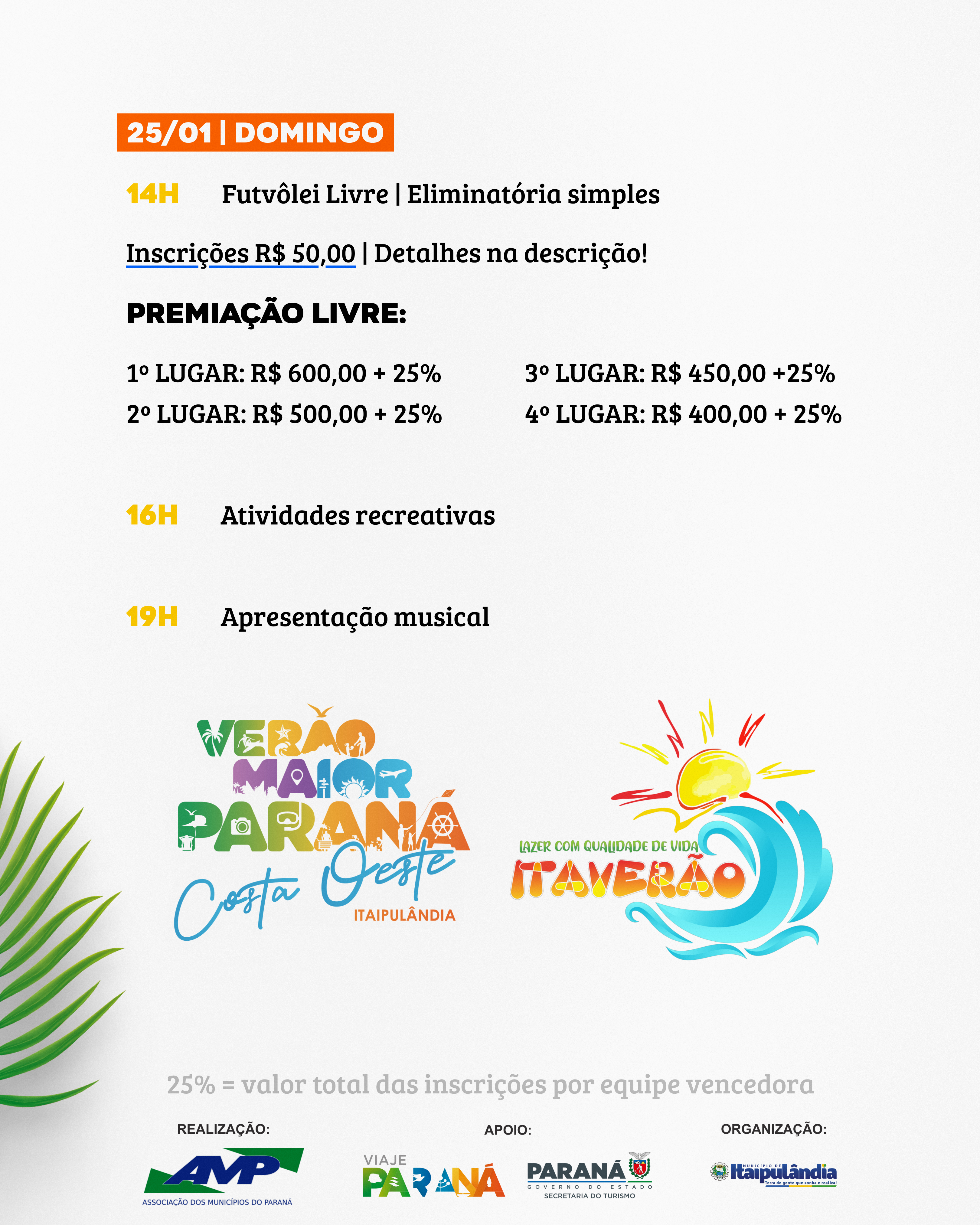 As inscrições podem ser realizadas antecipadamente (pelo WhatsApp (45) 3559-1108 ou no DME de 21 a 23 de janeiro) e no dia da competição, na tenda da organização (das 08h às 09h). O valor das inscrições é de R$ 50,00, que serão convertidos em premiação. O pagamento deve ser feito no dia da competição junto a tenda da organização, em espécie (moeda nacional) até às 09h do dia 25/01, validando assim a inscrição.
