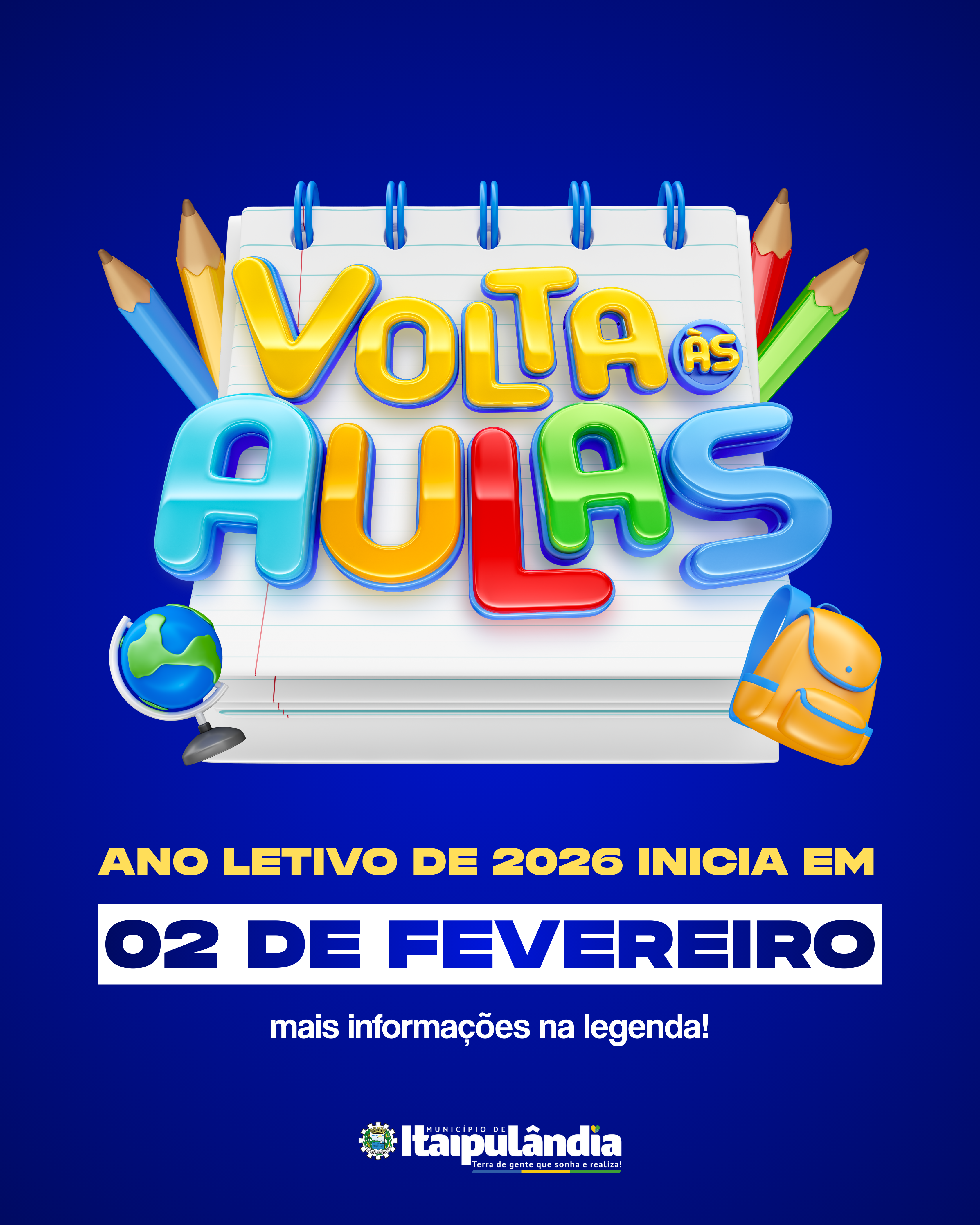 O ano letivo de 2026 na Rede Municipal de Ensino de Itaipulândia terá início no dia 02 de fevereiro, marcando o retorno das atividades escolares para os alunos da Educação Infantil e do Ensino Fundamental.
